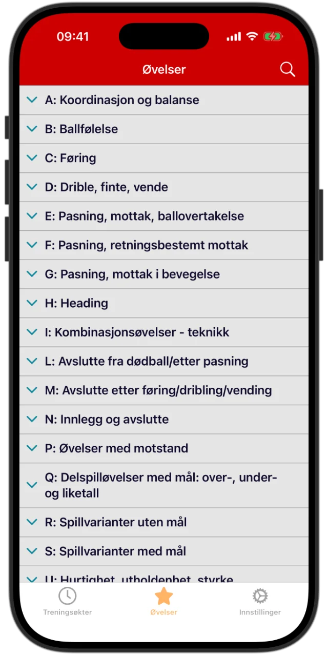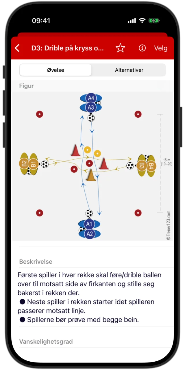 Har du lyst til å tilpasse økta litt? Ikke noe problem. Hvis du ønsker å bytte ut en øvelse, kan du enkelt velge fra den store øvelsesbanken. Du finner også beskrivelser av hvordan øvelsen kan gjøres enklere eller vanskeligere. På den måten kan du justere etter nivå, antall spillere eller vær – uten å måtte finne på alt selv.
